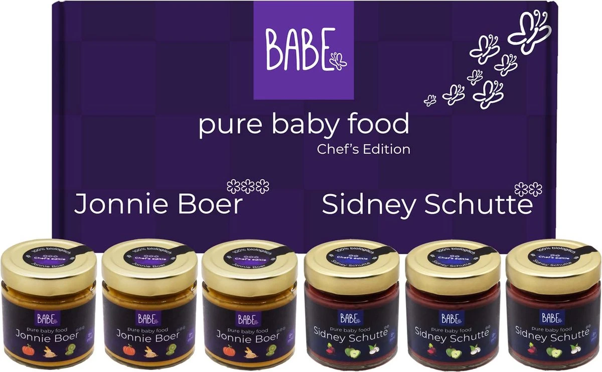 Babe Chef’s Edition –Jonnie Boer*** 3 Michelinsterren Chef van “De Librije” in Zwolle en al jaren de nummer 1 chef van Nederland en Sidney Schutte** 2 Michelinsterren Chef uit Amsterdam, 100 % biologisch met de hoogste kwaliteit, heerlijke smaken, babyhapjes voor 8-36 maanden – 6×200 gram babyvoeding