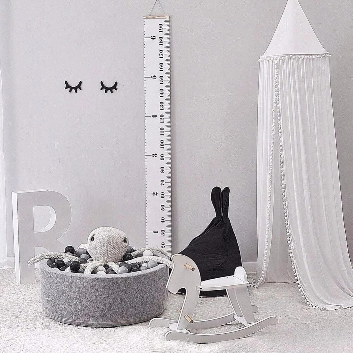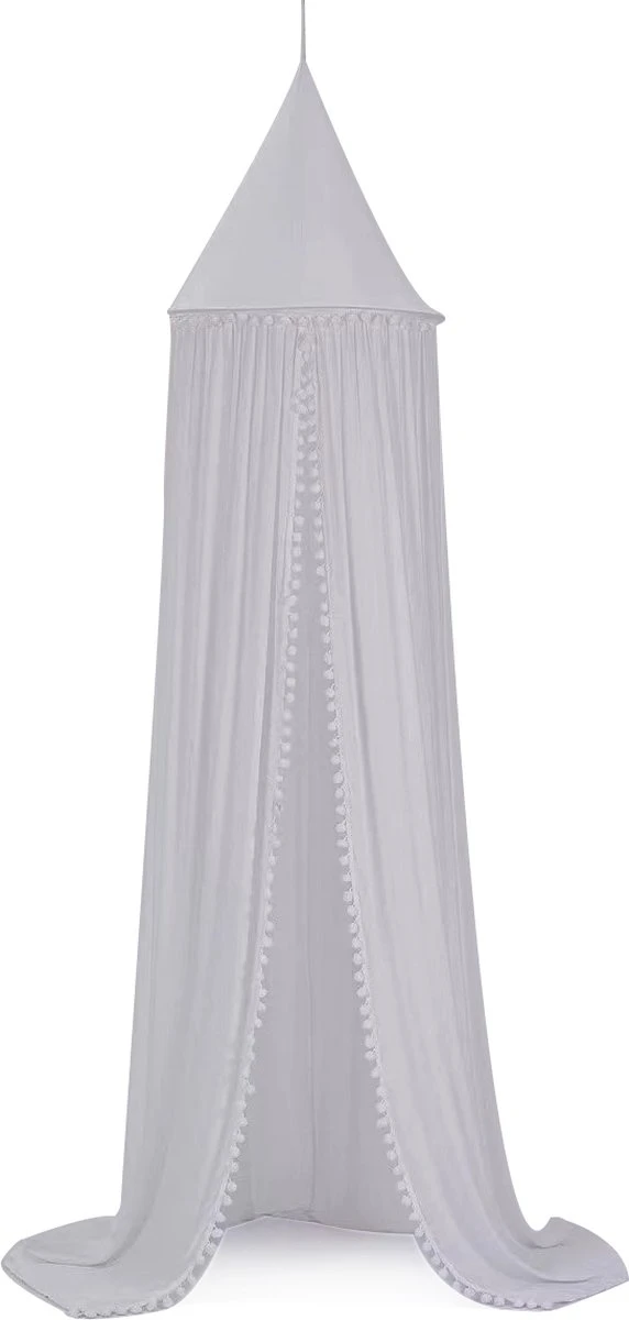 Een prachtige baby klamboe van 245 cm in vijf mooie kleuren: wit, grijs, creme, okergeel en zalmroze. Deze uitvoering beschikt over leuke pompons die over de gehele klamboe lopen, super schattig! De klamboe is ideaal voor boven het baby bedje, maar kan ook gebruikt worden boven een speelkleed of elders in de kinderkamer.