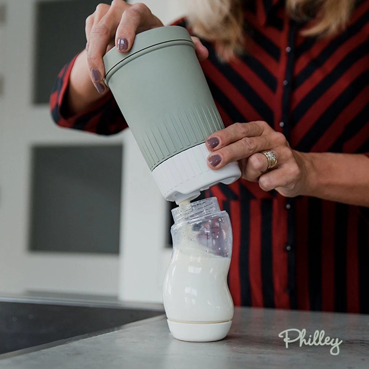 Het grootste voordeel van Philley is dat het klaarmaken van een babyflesje supersnel gaat en zonder morsen. Nooit meer schepje voor schepje afstrijken en omkiepen in de smalle opening van de fles. De splitter in de kop van Philley, zorgt voor exact de juiste hoeveelheid per klik (4,6 gram). Eén keer draaien tot de ‘klik’, staat dus gelijk aan 1 afgestreken maatschepje melkpoeder.Voordelen van Philley