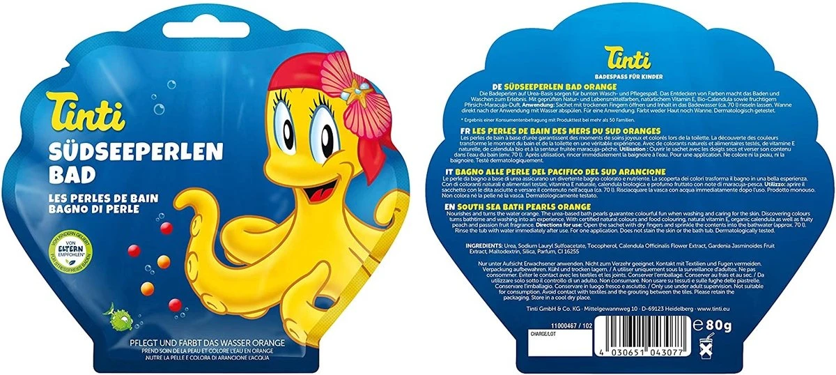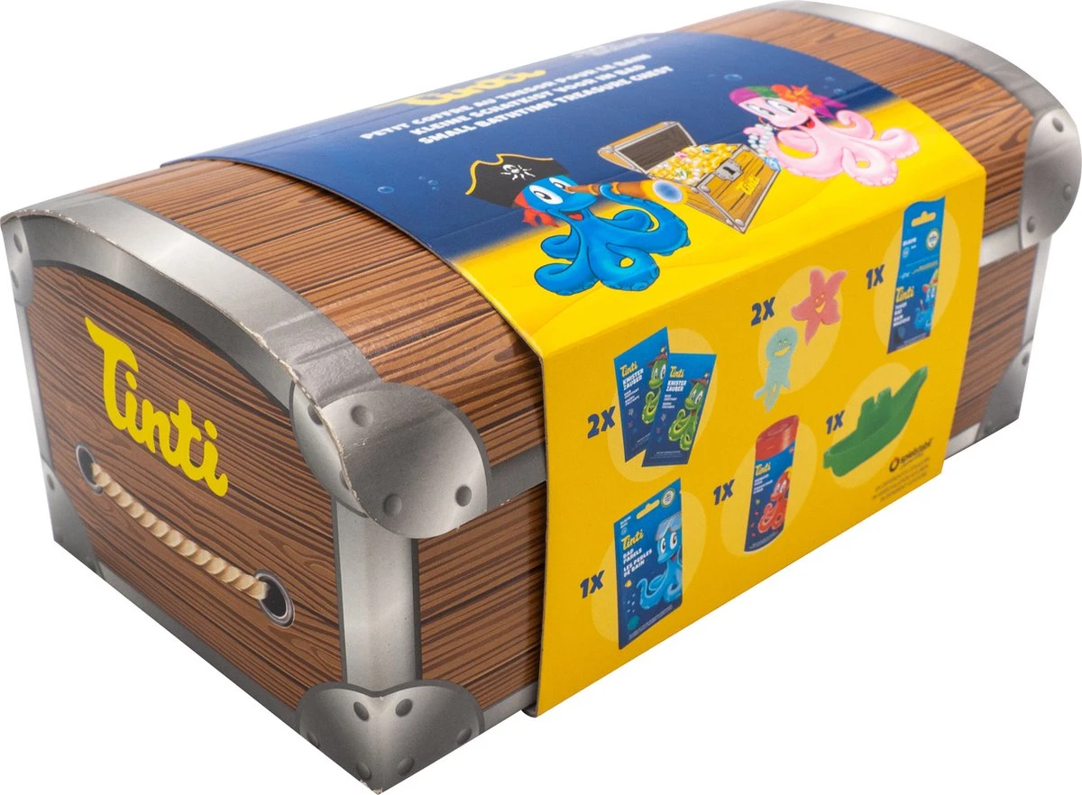 Tinti verandert de badkamer in een kleurrijke belevingswereld: Of het nu vrolijk kleurrijk badwater, zeep om te kneden of knetterend badwater is – met zoveel plezier in het bad kunnen uw kinderen nauwelijks wachten om zich onder te dompelen in kleurrijk badplezier. De 8-delige Tinti schatkist biedt spannende producten voor afwisseling en verrassingen in het bad.